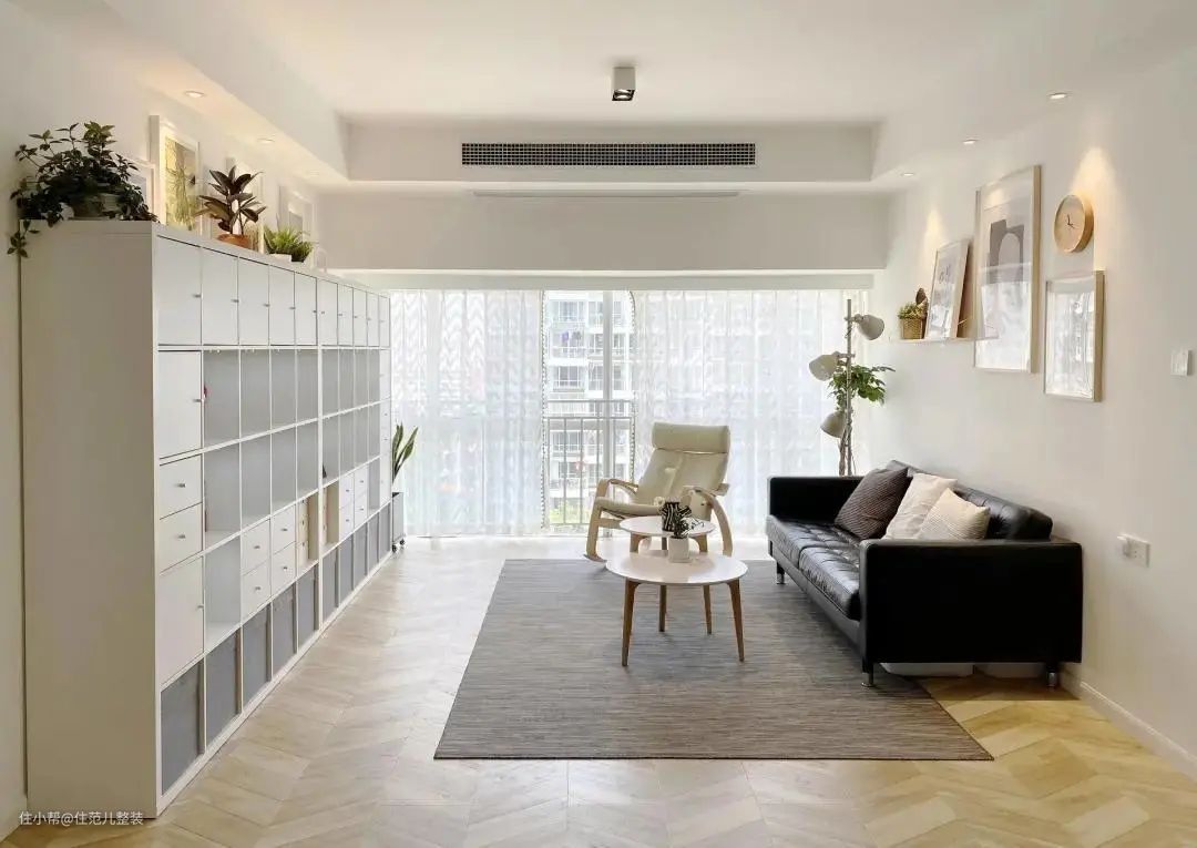 置物的边几+储物的矮柜,客厅根本不需要笨重的茶几了,方便收纳的同时,也让客厅看起来更加“空”,小家也能变大不少。