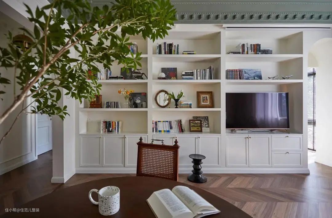 住范儿客户珊珊,家里有大量的书需要收纳,就在客厅做了整面墙的半开放格电视柜,65寸的电视下面还放了收纳篮,以后可以装孩子的玩具和杂物。