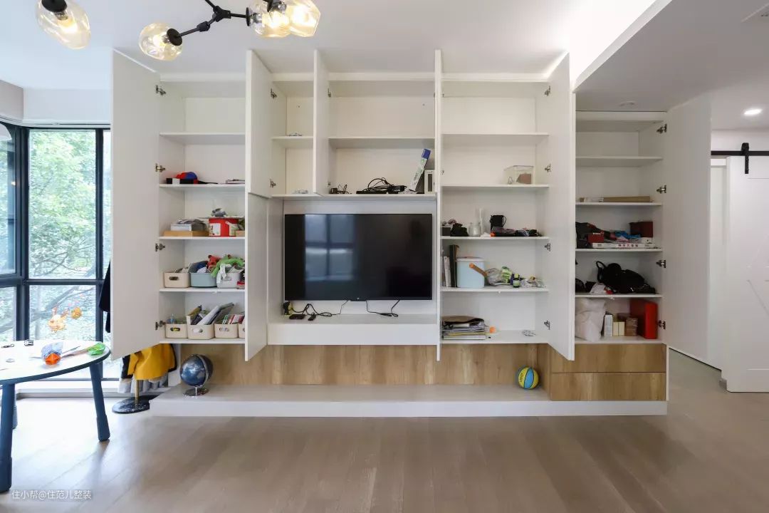 大柜子全做成封闭式,会比较压抑,推拉门的设计就很好用,可以推到两边把柜子藏起来,也可以拉齐到中间,把电视藏起来,拿取东西也变得更方便。
