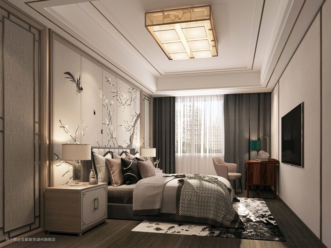 主卧空间沿用的色调与整个空间相互呼应,精致中带有内涵。每个饰品都展现出房主沉稳的中式情节,每个细节都恰到好处。中国画的花鸟元素融入在背景墙和床品等细节里,于细节处打动人心。将和谐的寓意带入居住空间,为生活造景,人类与自然于此交融。