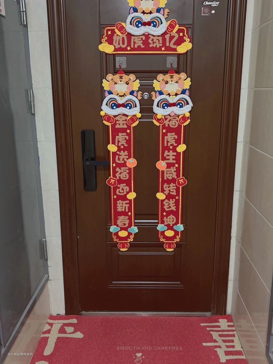进屋前,你可以感受到新家的魅力,你看起来很开心。门上贴着一副非常精致个性化的春联,大小位置都恰到好处。安装了指纹锁,可以多种方式解锁,更加智能。地上有一张红色的“平安喜乐”地垫,很受欢迎,大家都很喜欢。