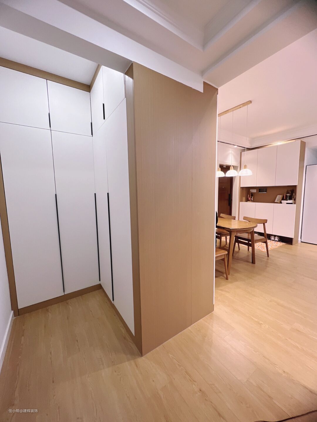 过道的位置设计得感觉像衣帽间,定制橱柜的做工和质量也不差。全屋定制的橱柜都是原木色橱柜的白色衣柜门,符合原木装修的实际风格。我真的很喜欢他们。