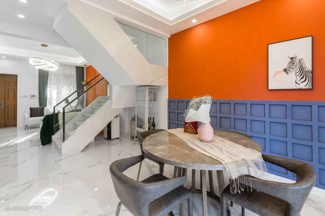 餐厅上半部分仍然采用橘色背景墙,下半部分采用田字饰面板,凹凸状,很有质感。 木纹石板餐桌,简单雅致。