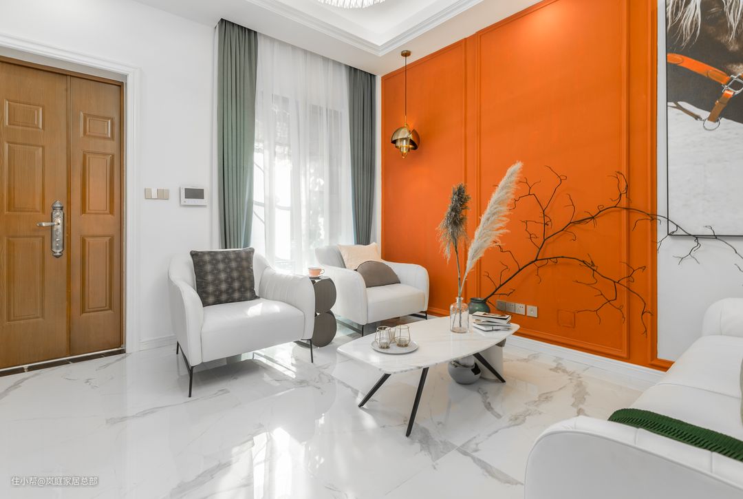 客厅背景墙采用爱马仕橙色的搭配,4.5cm的石膏线,客厅背景墙形成了一幅深秋景象,很有意境。
