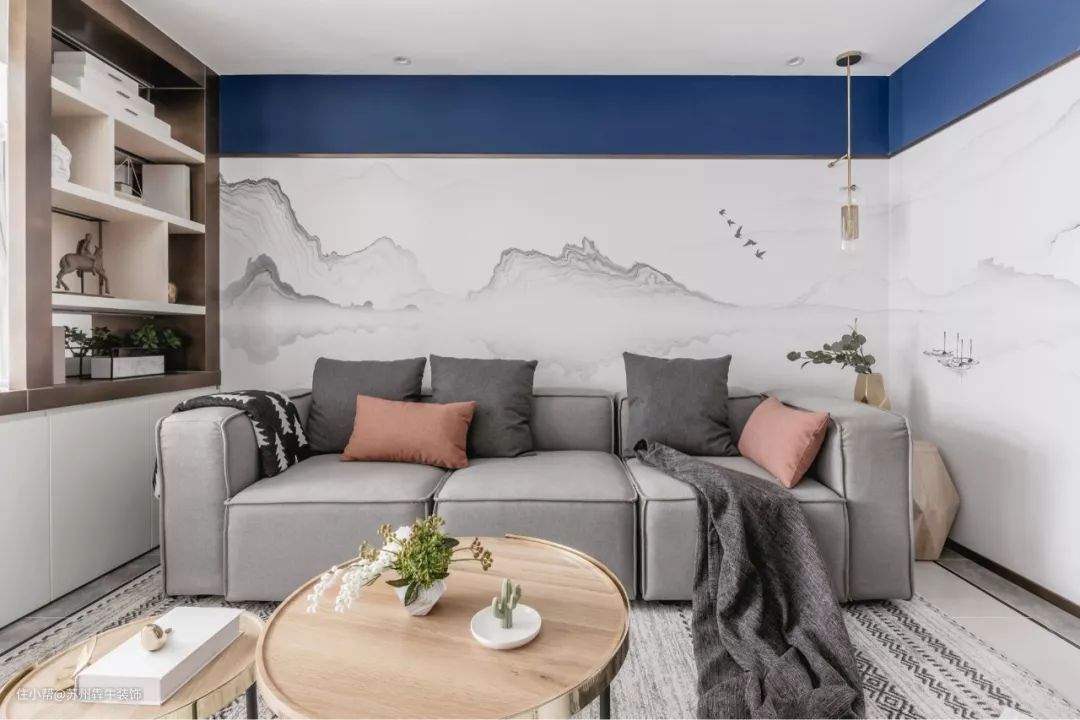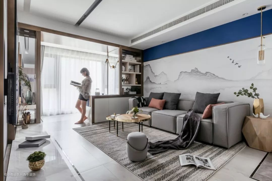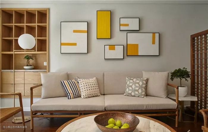 布艺沙发是简约现代风格的元素,用在新中式风格的客厅里,让空间氛围趋于现代舒适雅致,也是一种可以考虑的设计布置方式。