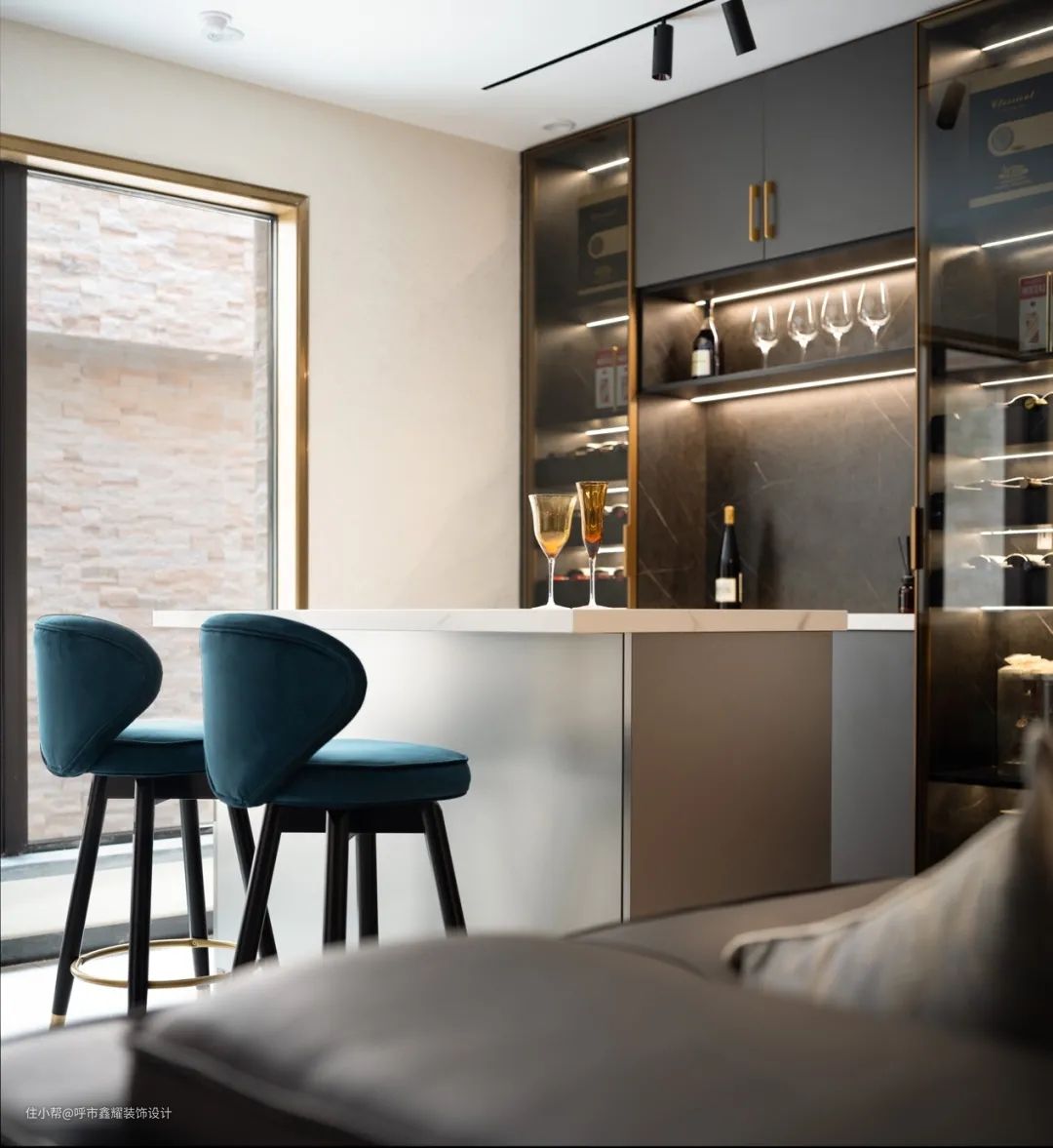 深灰色板材、天然纹理石材和金属玻璃柜门,在线性灯光的作用下,呈现出高级定制轻奢的质感。品酒台加高脚绒面圈椅的组合,将这里打造成一个温馨的家庭小酒吧,世上最美好的事,莫过于和彼此欢喜的人,共同品味那淡淡的甜和瑟瑟的酸。