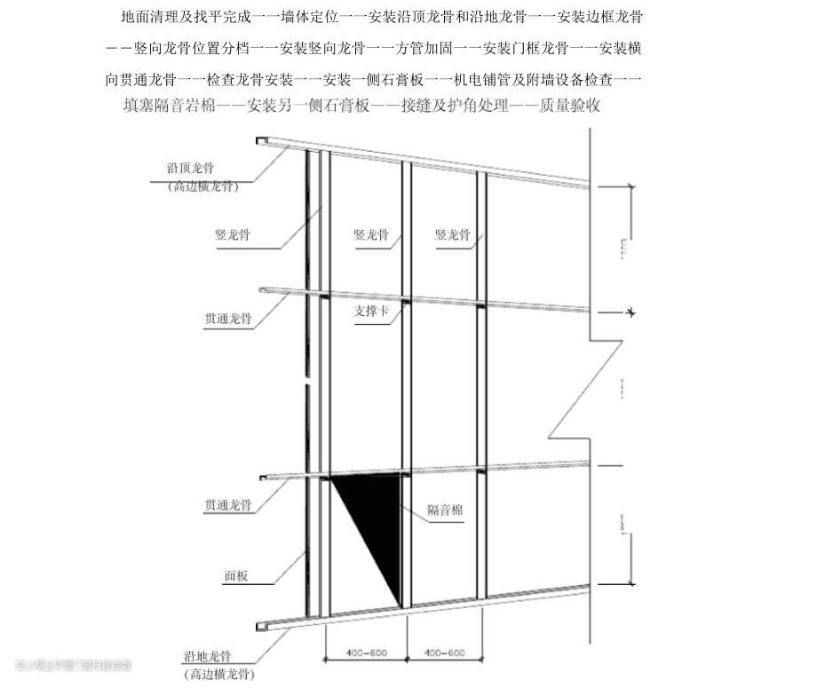 隔墙穿心龙骨——隔墙竖龙骨——隔音棉填充——接缝处理——石膏板基层——腻子找平(两次)——乳胶漆三底两面