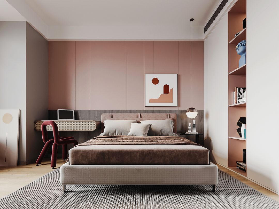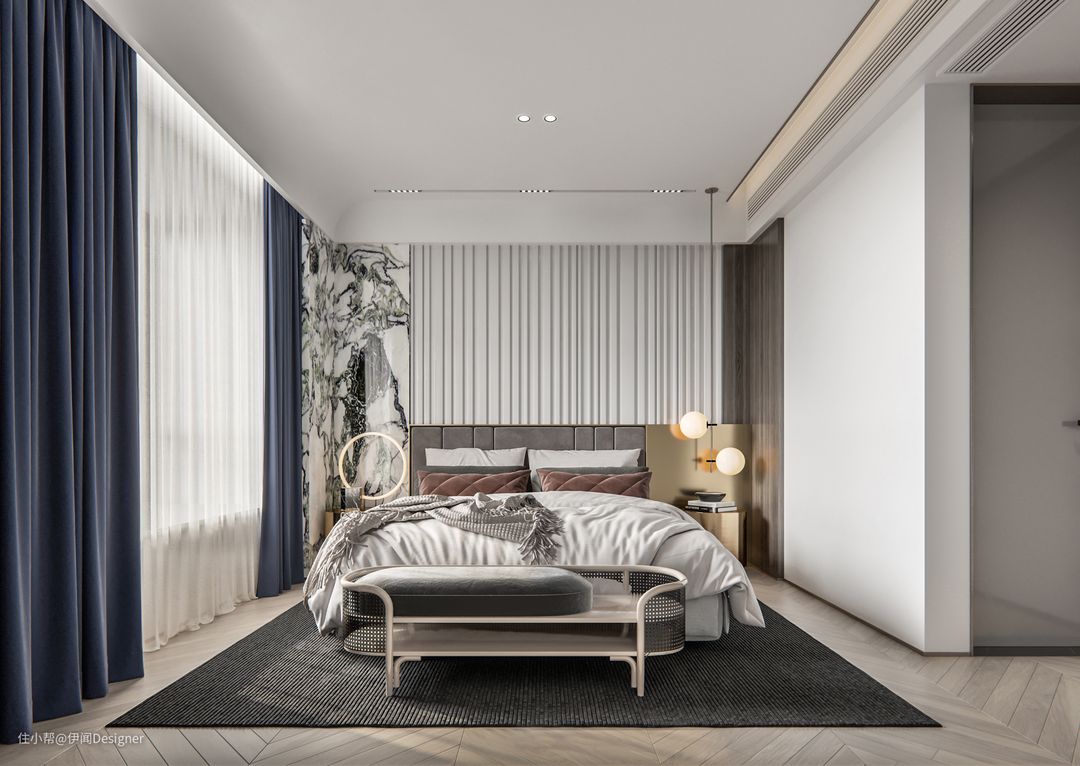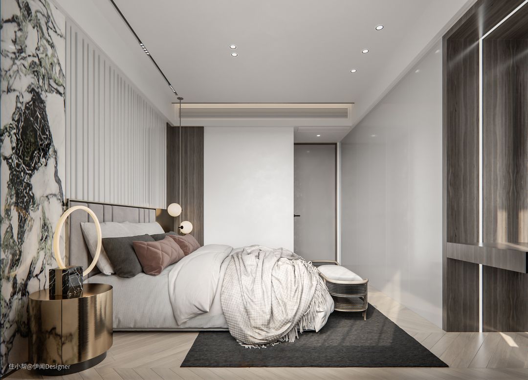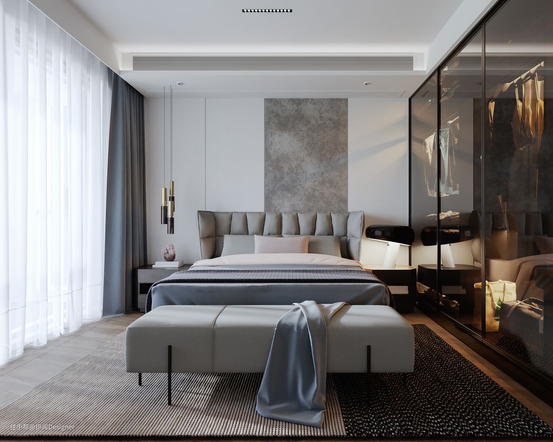 常见设计是将中央空调位置预留在衣柜上方,这种一般是侧送侧回,虽然回风🆗,但需注意冷凝水处理问题(若要如此设计,出风口、回风口至少1m间隔),检修口通常安装在柜子里