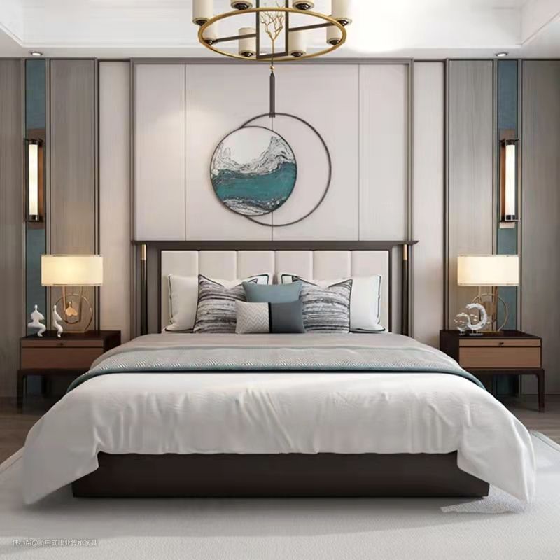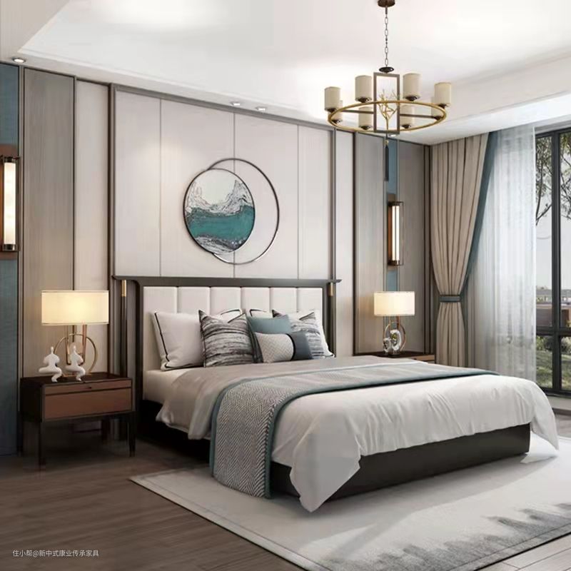 一块水墨画地毯与整体的浅色的家具形成白墙黛瓦的效果,床头以及背景墙的设计手法采用直线条搭配木色金属线,让线性的刚结合软装的柔,中式的阴阳调和之美。