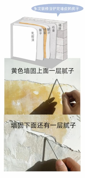 多次装修,没铲完的墙面的结构是墙体、石膏、腻子、墙固、腻子、乳胶漆的结构。