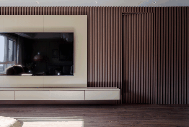 柜体定制了与客厅一致的梅子色和奶油灰。
