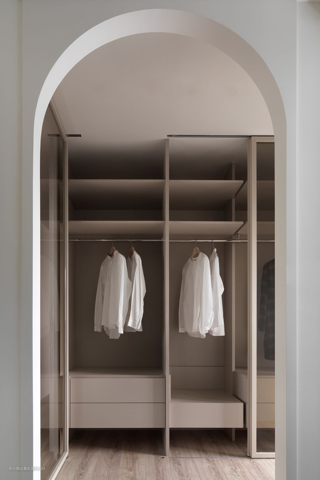 小也不能省略的便是衣帽间,打造了一排隐形柜子,下面空了一个区域,可以留作放置鞋子使用,打扫方便,整体看效果美观。