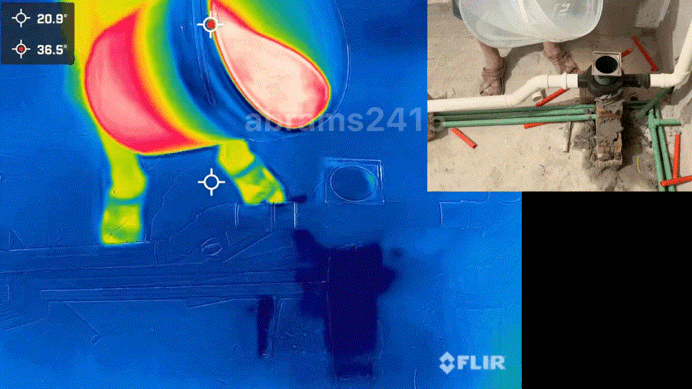 ▲回填前做了一次试验,热水先倒入水母地漏,从热成像仪可明显看到先填满水封后再进入多通道汇集器,填满总水封后进水总管。同时热成像也能看出是否有漏水点。