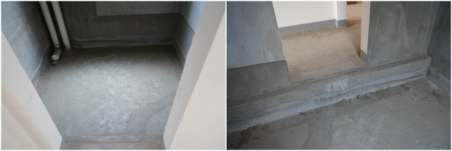 ▲首先在回填时确保淋浴区比外面低5cm,这样才能后期预埋挡水条,降低挡水条高度。干区铺完地砖后,大理石挡水条高度大大降低。