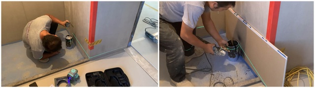 ▲地砖铺好后,我做的无挡水条下沉式淋浴区。安装师傅安装最终完成面来切割多通道汇集器多余的管子。