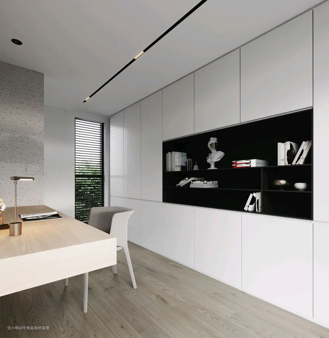 书房,静修之地黑白柜体对比,自然颗粒纹理温暖灯光细节处彰显质感