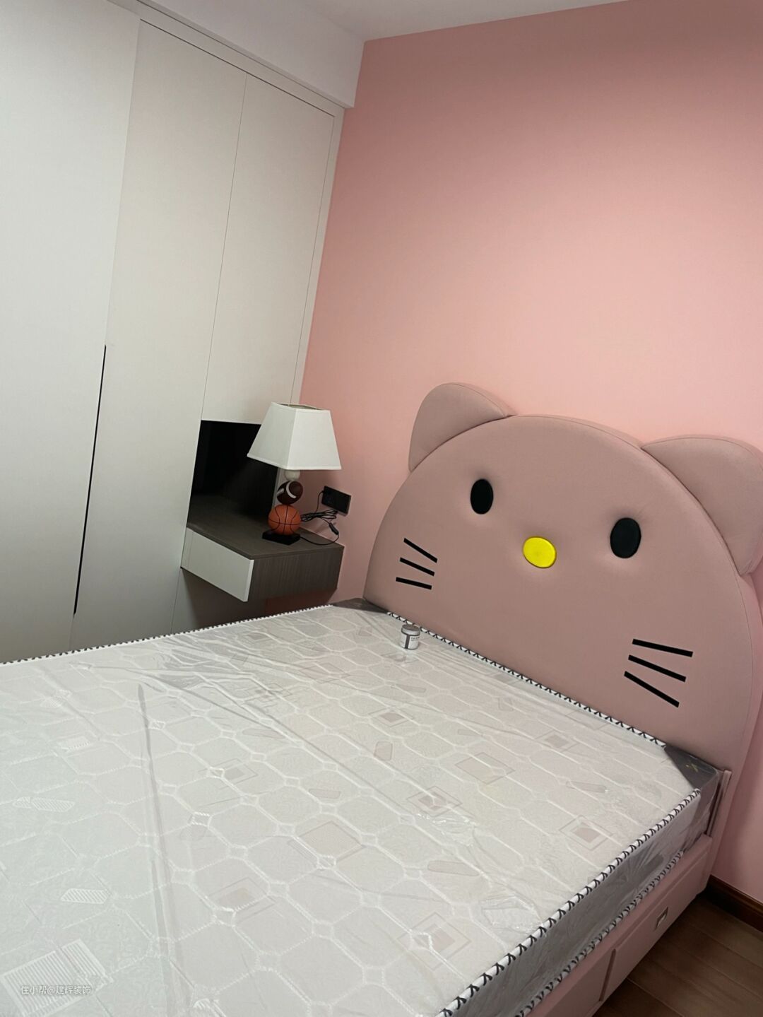 考虑到家里孩子的需求,儿童房配了一张兔子形状的单人床。家里的孩子都很喜欢,很有个性。床头墙刷成粉色,给人一种少女心。定制衣柜直接上顶,不浪费空间。如果家里的儿童房也喜欢这种类型的床,可以参考一下。主卧基本也是这样的效果。衣柜设计的时候和床头柜融为一体,看起来很有设计感,但是床头的背景墙是灰色的。选择地面铺木地板,没有瓷砖的冰冷感,更加舒适。床垫还没来得及装修,所以不影响效果。