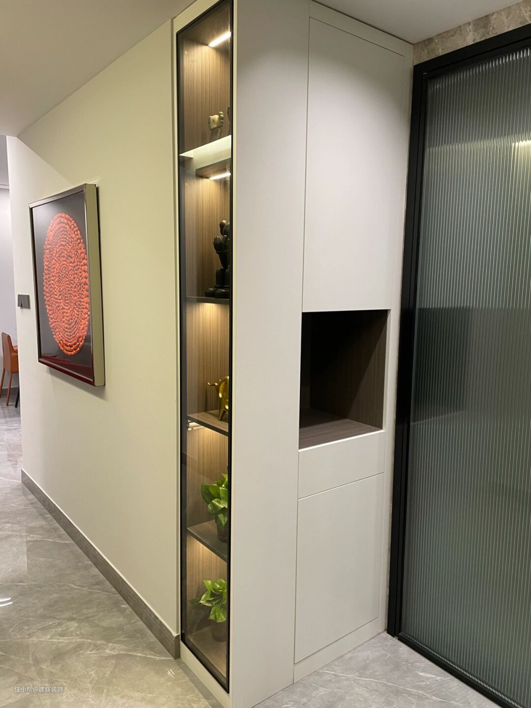 卫生间门口设计了一个非常实用的储物柜,可以适当增加一些收纳空间。长虹玻璃门装的,颜值高,我很喜欢。