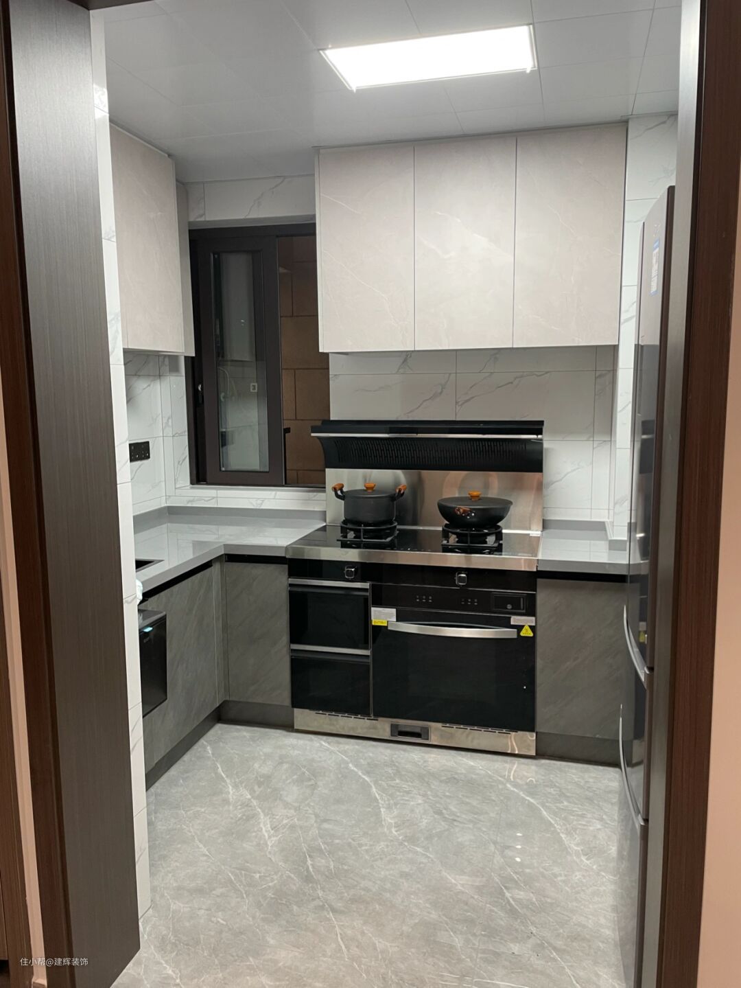 厨柜根据结构定制,安装集成灶,都是年轻人比较喜欢的款式。旁边还有冰箱的预留位置,用起来方便很多。整个空间都是灰色的,很脏,和整个空间完美搭配。在这样的厨房做饭很刺激。