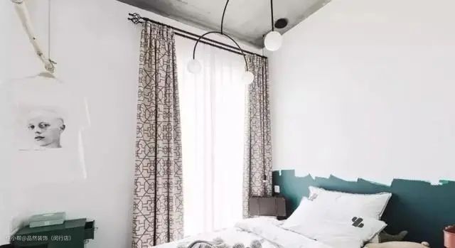 床头小吊灯好可爱,橙色纹理的窗帘与半高绿色床头背景在灯光的映衬下,让人十分放松。