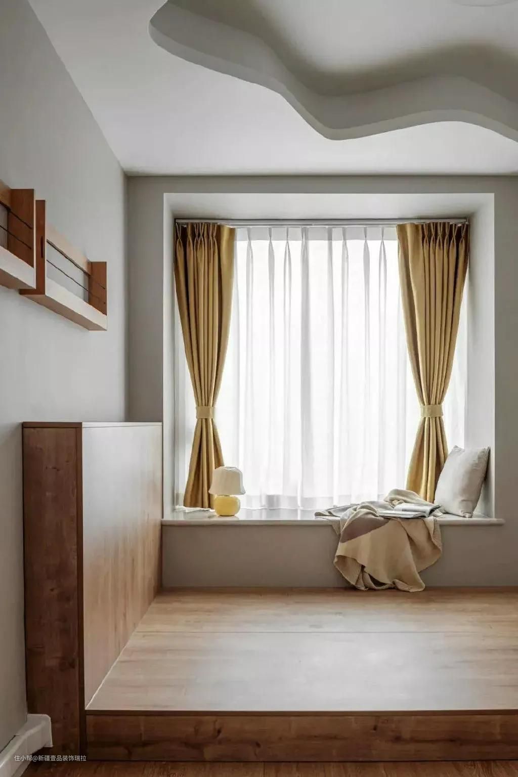 书房作为主卧的补充,释放超大收纳空间,整面墙的储藏柜满足换季衣物收纳。大书桌也满足了他们同时使用的电脑的需求,利用飘窗台做了可以储物的抽屉。临窗设计的转角书桌,哪怕两个人共同使用,都不会感到拥挤。而墙面放弃传统的吊柜,并安装上隔层,也让空间轻盈了许多。