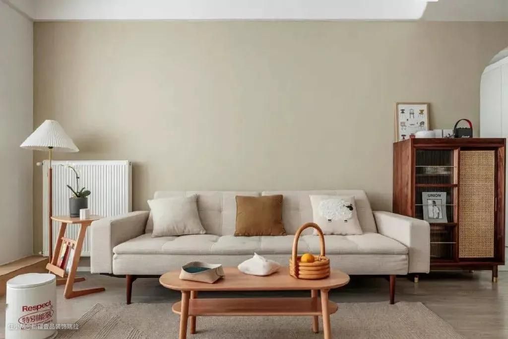 阳台增加的储藏柜 做了到顶的设计,可以放下行李箱,吸层器等大的物件,另一侧是制作的矮柜,坐人储物均可。沙发背景墙涂抹一整面菩提黄,以安静的力量衍生出无尽的感知、互动与共鸣。沙发旁增加的实木小边柜是他们喜欢的,能放下收藏的小物品。