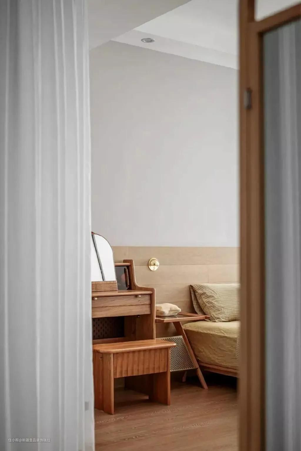 主卧作为家里的睡眠区,氛围感是十分重要的。因此,在保留整体基调的情况下,给床头墙面刷上灰色的乳胶漆,立马就为空间增添了一抹静谧的气息。而护墙板造型的原木床头,也呼应了空间主题,非常温暖。