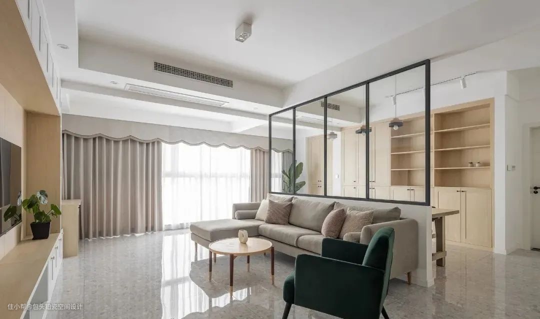 家里房间少的,还可以从横厅里隔出一间房来,为保持空间的通透性与良好的采光,在做隔断的时候注意,尽量使用玻璃隔断、玻璃+半墙这种不影响采光的材料,或是布帘这种灵活度高的材料,来搭建房间。