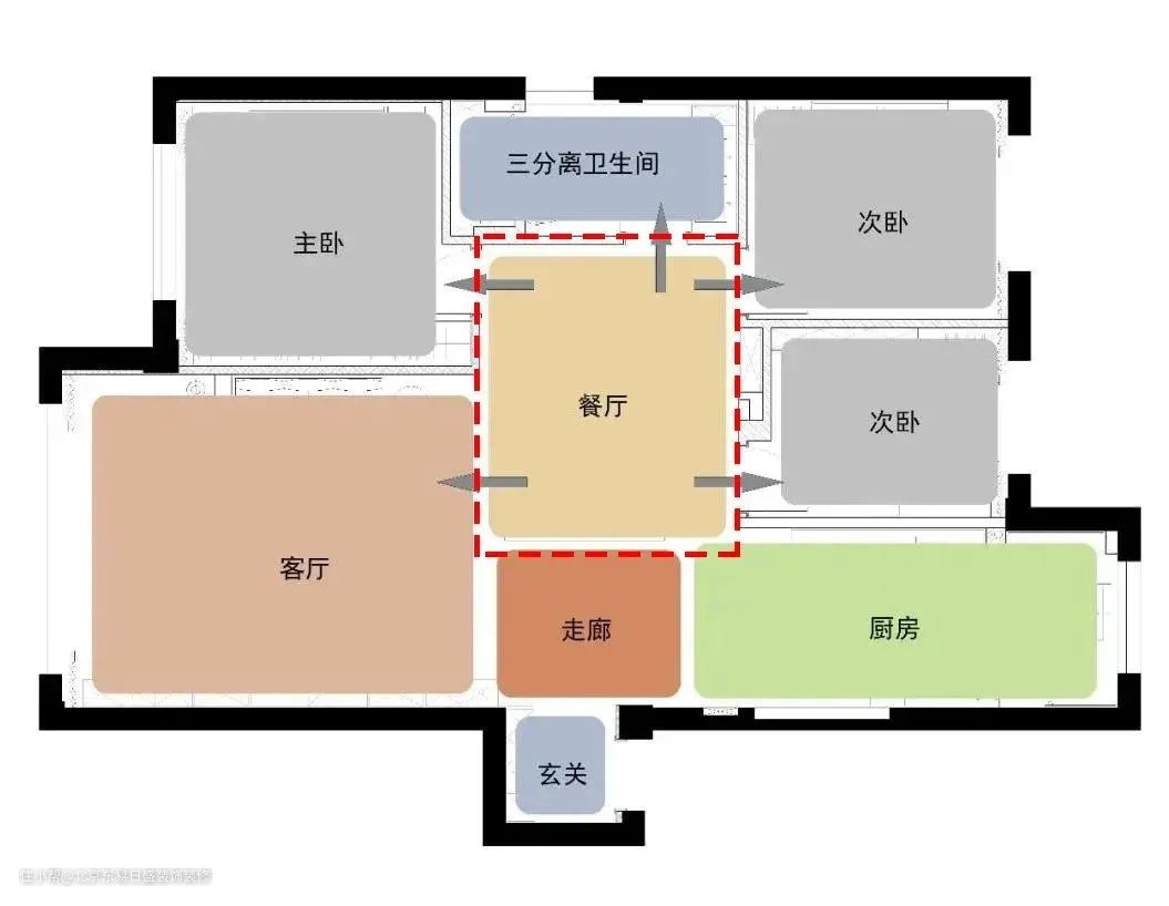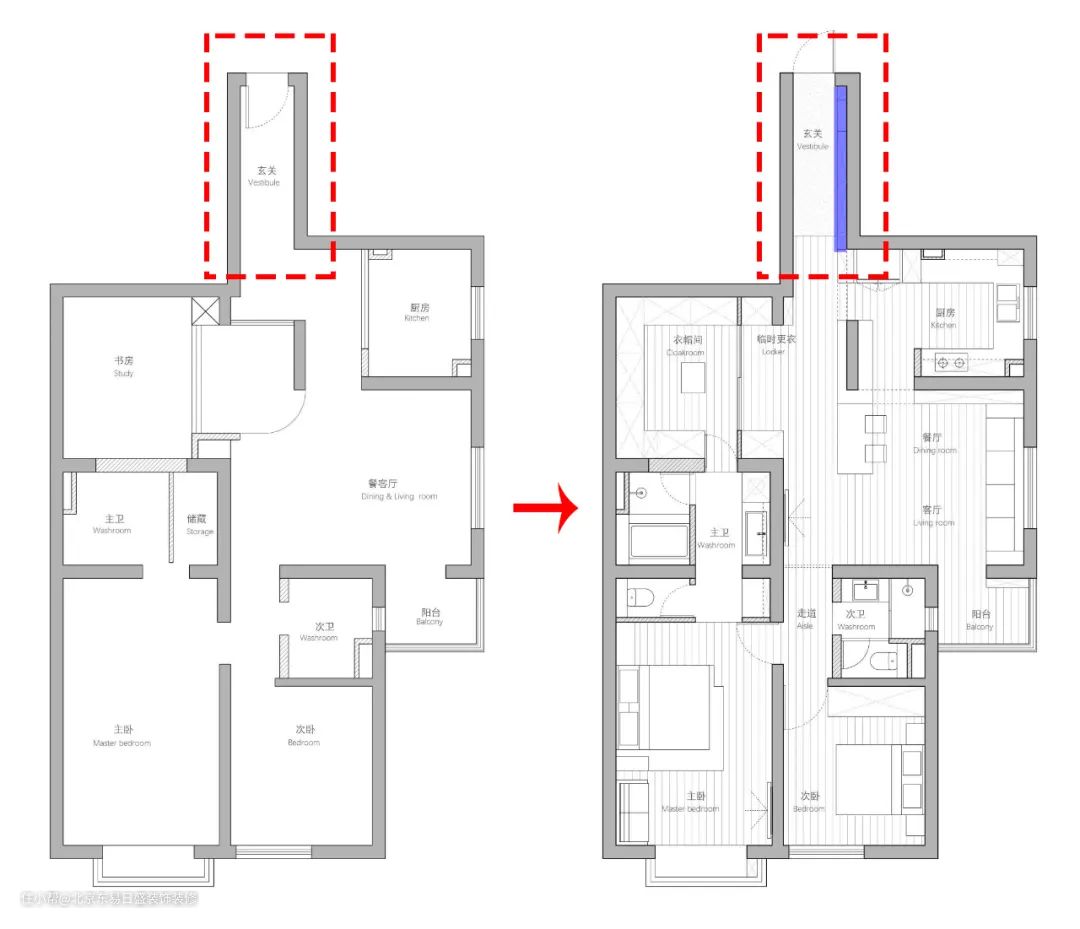 如上图,玄关与主卫之间的走廊很长,再加上相邻空间数个碎小走廊,显得很是鸡肋,设计师将走廊结合次卫拆改,改造成综合餐厅空间: