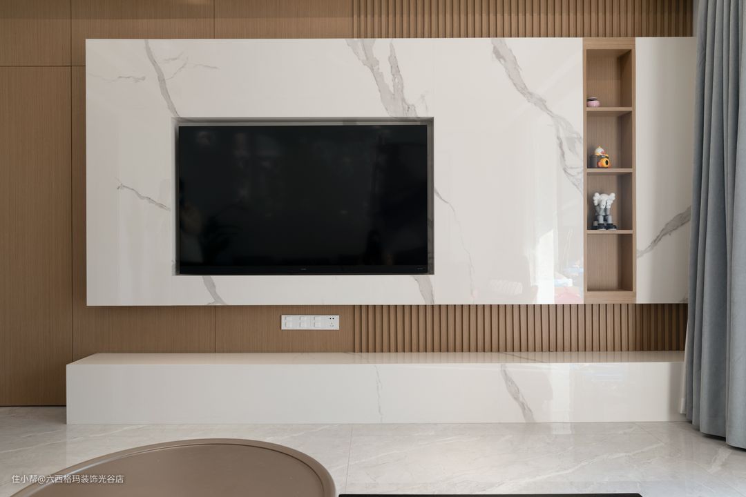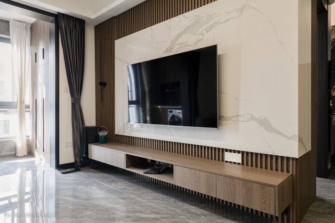 木格栅和岩板的组合,提升了墙面的层次感,去掉传统的电视柜,不易积灰不占空间。