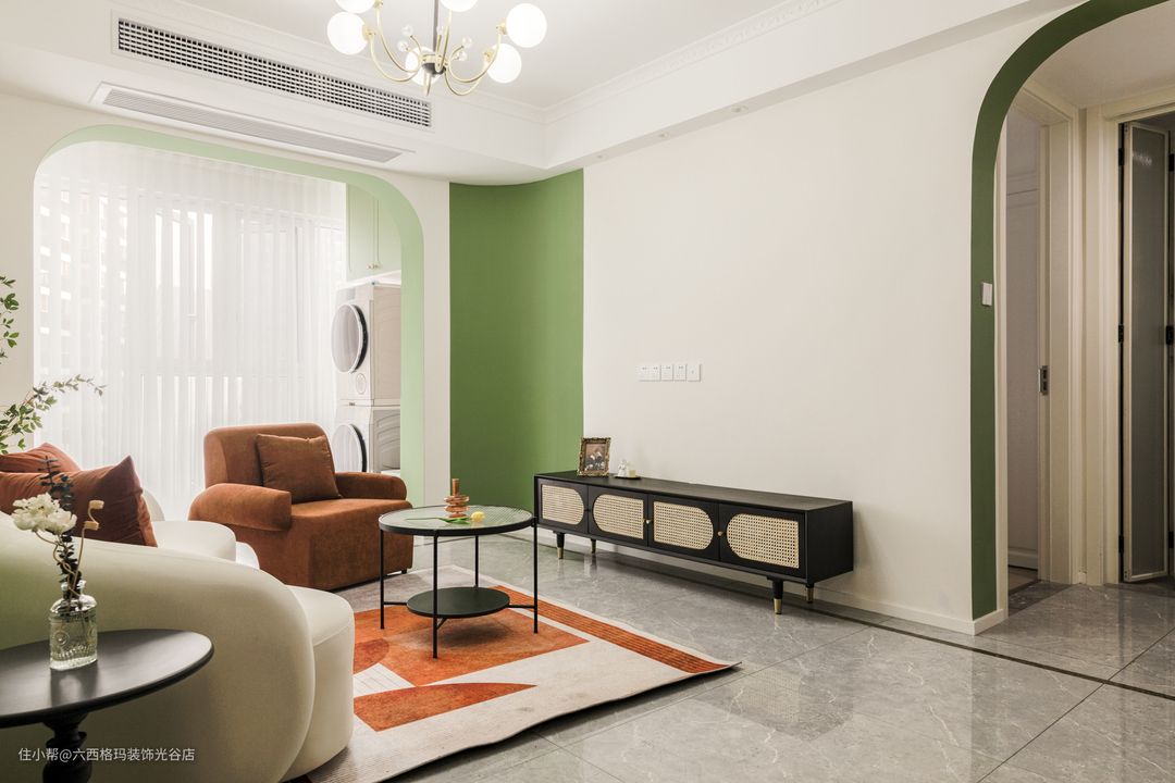 背景墙连接阳台墙面做了半圆弧设计,利用绿色做拼色墙,让空间不再单调且有层次感。