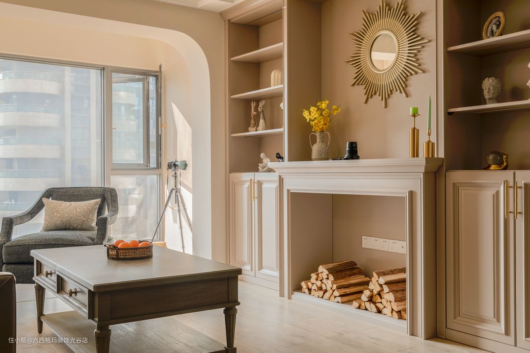 壁炉造型给空间营造多一份复古浪漫的气息,整体以奶茶色为主,两边的储物空间也很大。