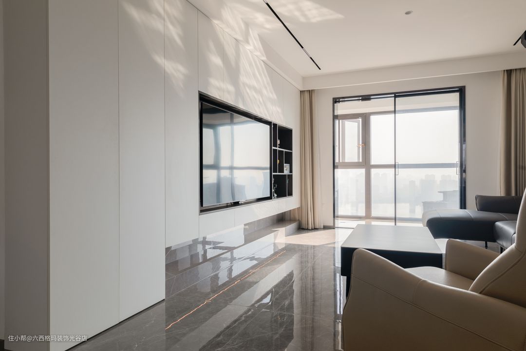 悬空电视柜与储物柜相连接,延伸了整体的视觉效果,下方悬空非常好打理不积灰。