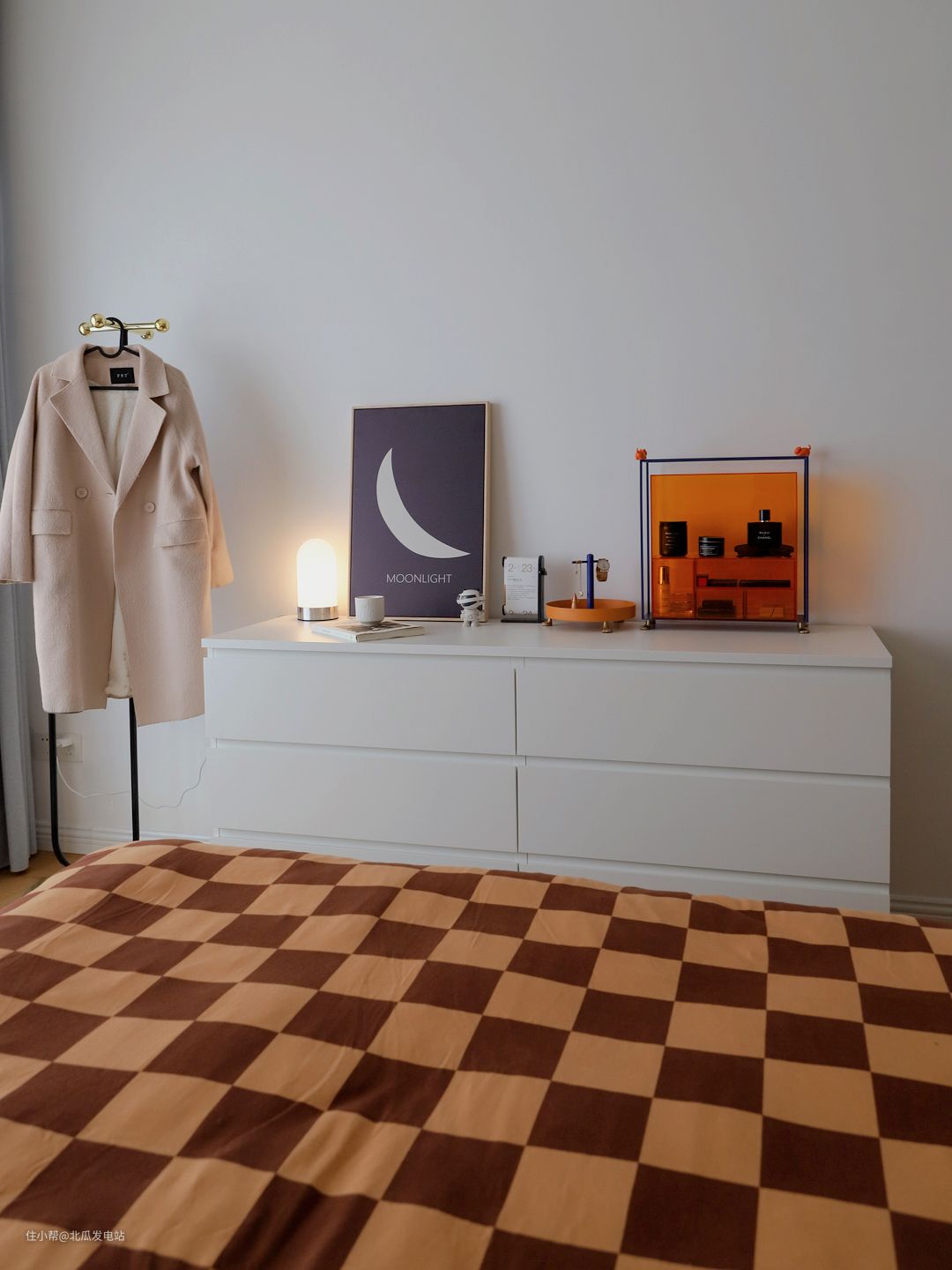 我没有买床头柜,而是在床尾用一个6抽屉的斗柜来解决卧室收纳问题。