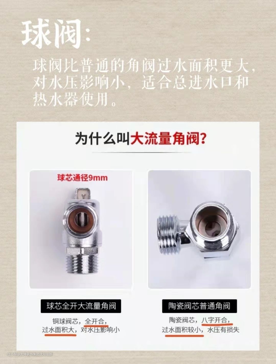 需要大水量的总入水口、热水器处,可以选择通水量最大的球阀;为了能更好区分冷热水,在水槽、热水器可以用有红蓝标识的冷热水阀;
