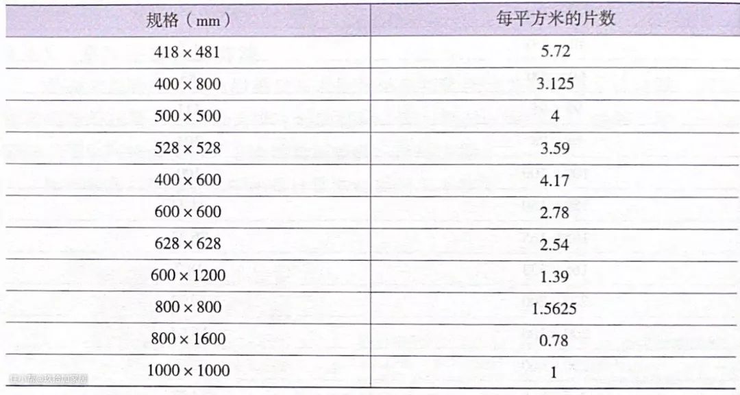 计算方式2:规格与每平方米片数换算表,一平方面积需要600*1200mm规格瓷砖1.39片。