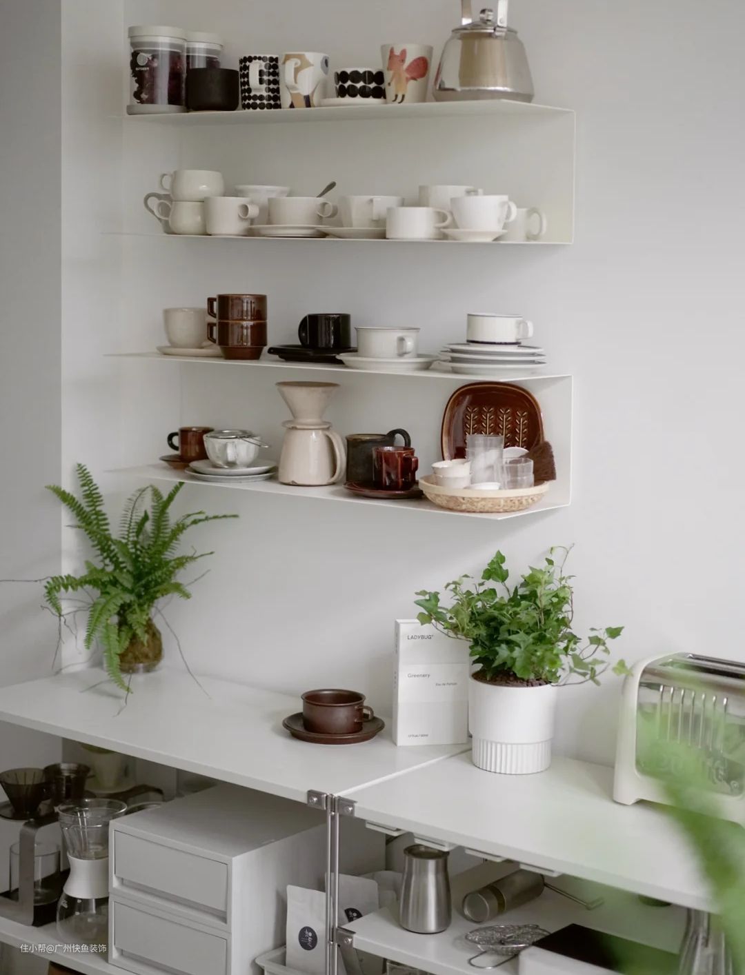 咖啡豆储存罐,咖啡杯,拉花缸,奶壶,糖罐,自己平时需要的器皿用具都可以归纳到一处,摆放整齐,便于取用。大部分人往往都是既爱咖啡也爱茶的,虽然叫做“咖啡角”,其实也是个茶饮角,水壶、茶壶、茶器、茶叶都可以放上。胶囊、茶包什么的小物料,可以收纳在抽屉里,也比较干净防潮。