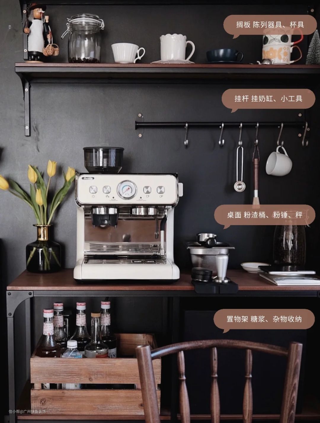 与奶茶具有同等续命功能,是很多人日常必备的饮品,随着咖啡控越来越多,很多人都会选择自己在家里做咖啡,而咖啡机也越来越成为很多人厨房里的必备设备之一。如果你想增加家里的咖啡气氛,那1平米的咖啡角是个不错的选择。