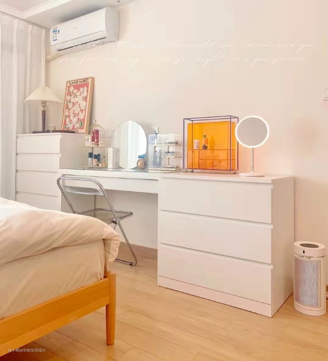 也可以充当梳妆桌,但尽量镜子正对床的问题,可以买能收起来的镜子,即用即取。