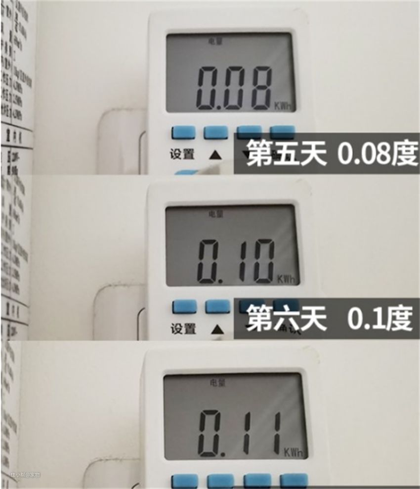将一台1.5匹的空调关机后,不拔插销,并接入空调专用电量仪器,每天记录电量变化,一周后电量总计为0.11度。按照这样计算,就算不开空调,每个月它也会额外消耗0.4度左右的电。