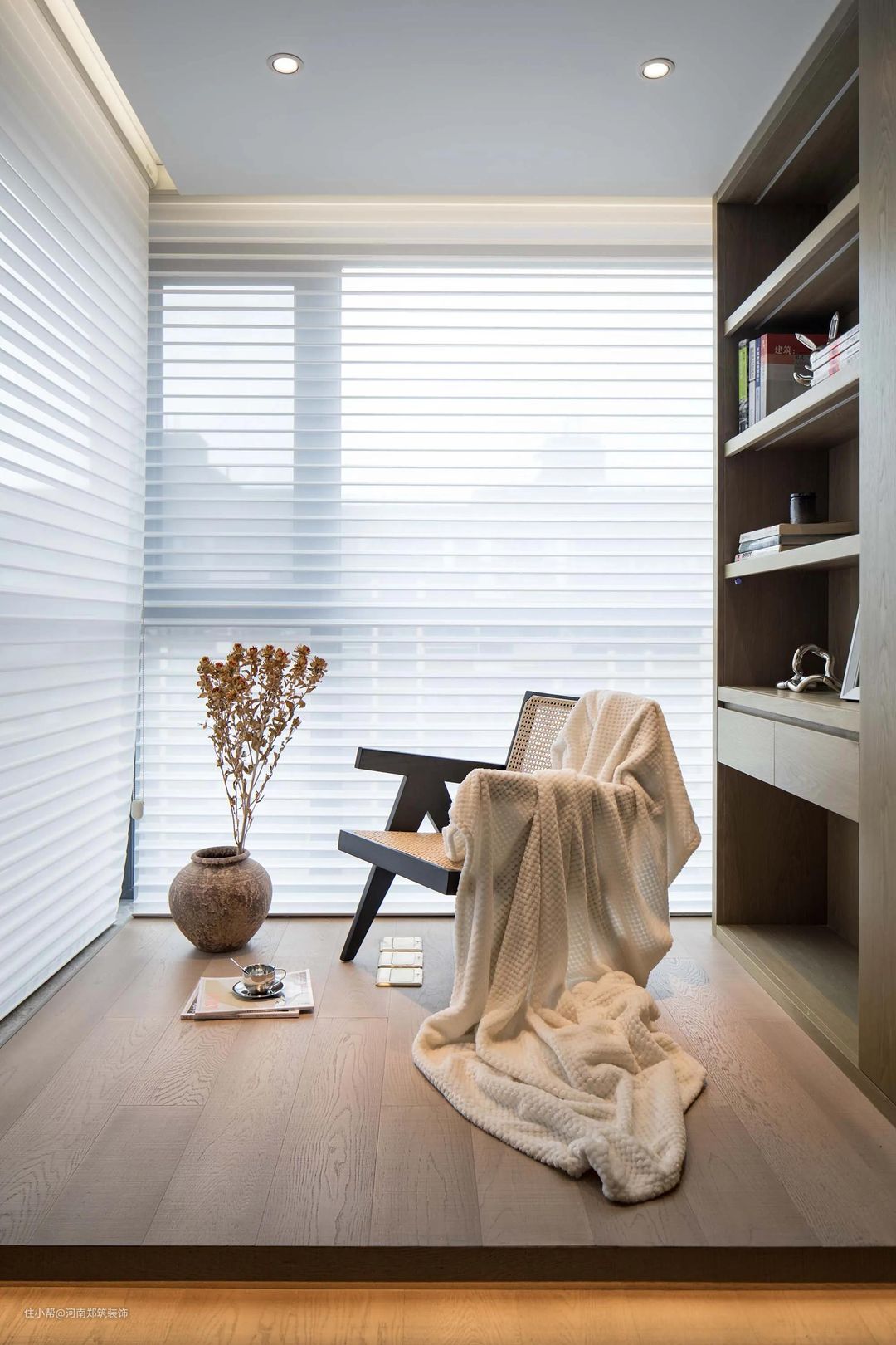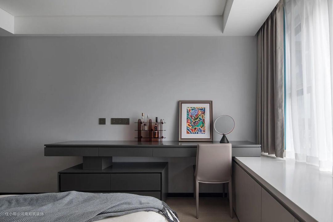设计改善了梁体较多的复杂结构,重新调整布局,增设开放式空间。这个空间,没有唯一的定义,可在书房或休闲空间之间自由切换。为凸显窗景进行了地台设计,辅以灯光强化功能区域的划分。
