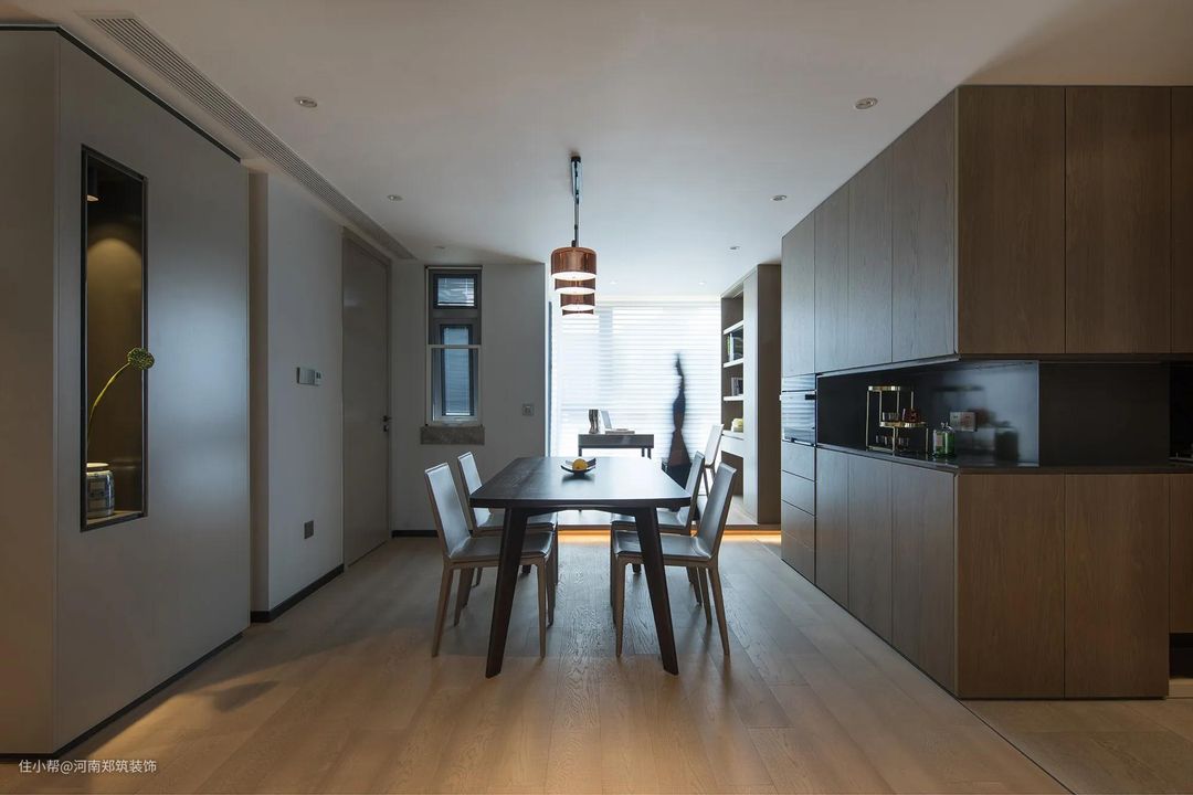 餐厅侧面,利用空间设计成了电器柜,有效释放了部分厨房空间,电器柜又与玄关转折过来的鞋柜巧妙结合,形成一体且立体的结构。充分运用空间的交流性,消弭空间与空间以及人与空间的距离感。