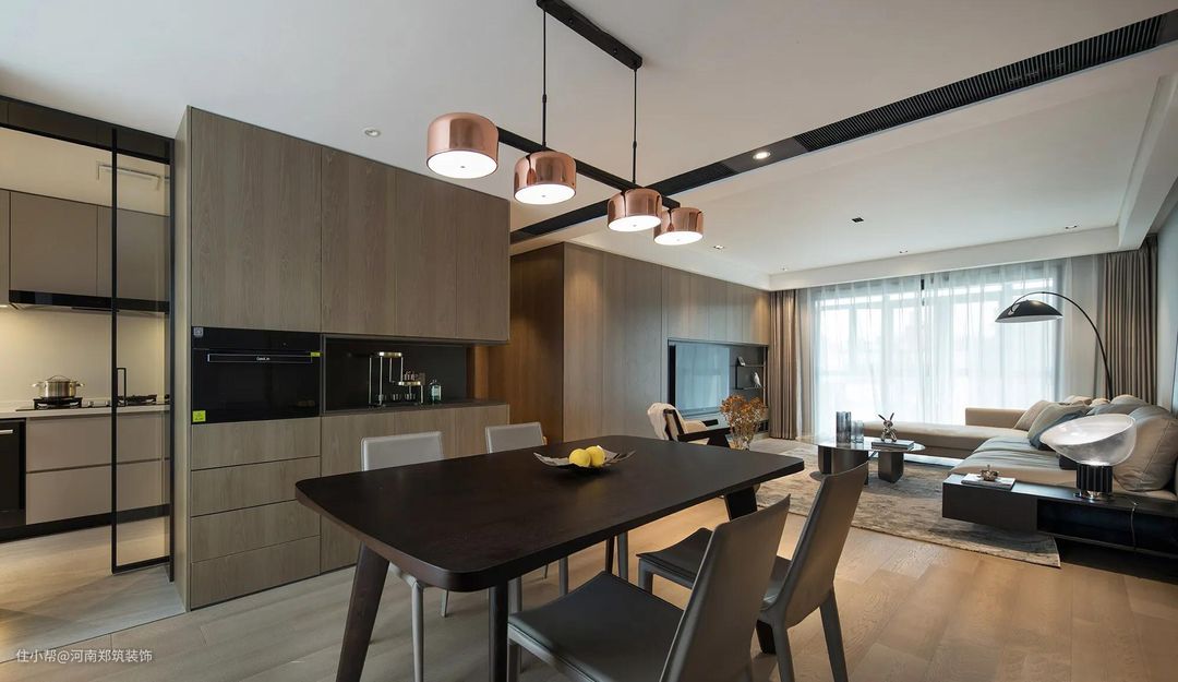 原厨房内部空间较局促,使用“里应外合”的策略,将电器柜移至外部空间,同时将移门进行“隐藏”,推开可完全藏到柜子后,让餐厅与厨房毫无隔阂。电器柜看似简洁的空间分割,实则经过全方位考量,能满足多种物品的收纳。