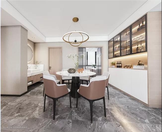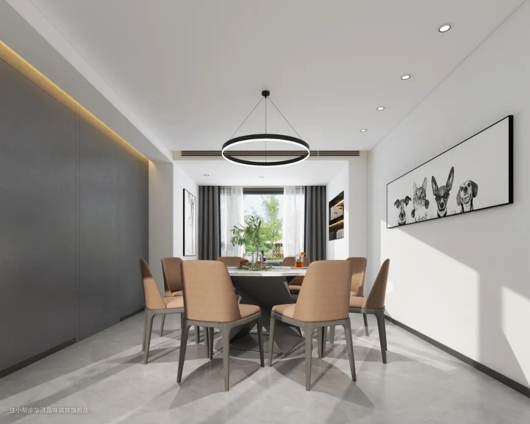 同客厅一样,餐厅的环境光也采用分散光源。在餐桌上方设计一个焦点光,也就是所谓的吊灯,就餐时可营造氛围,增加食欲。