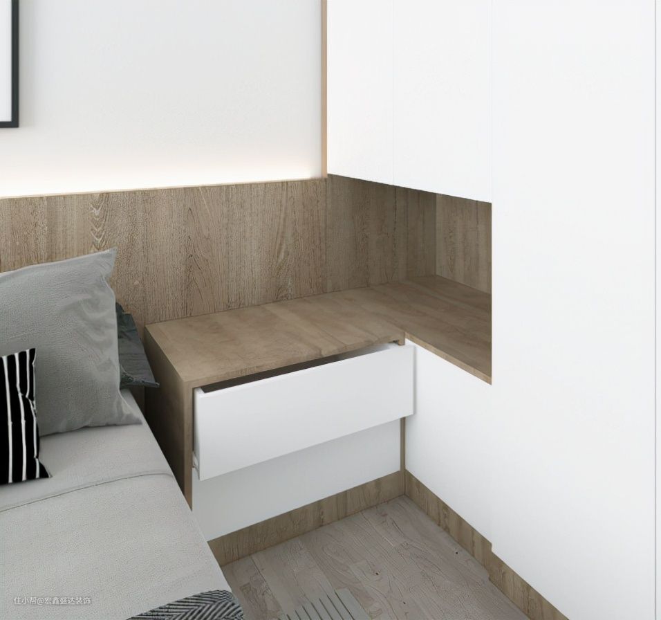 在事先考虑好床头柜后告诉木工师傅或者定制厂家尺寸后将柜门一分为二,底部柜门不可打开,放置一些不常用的被褥。这样就可以轻松打开了~