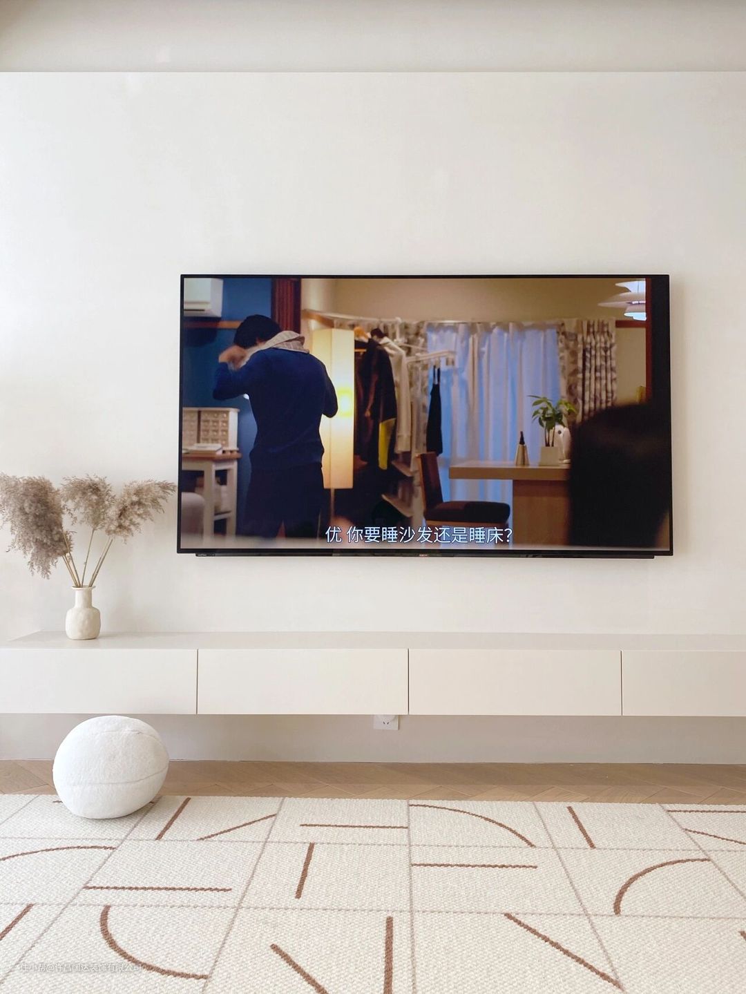 广受大家喜欢的弧形电视柜也是隐形壁挂的,正面电视墙看不到走线,会更加有一体感~