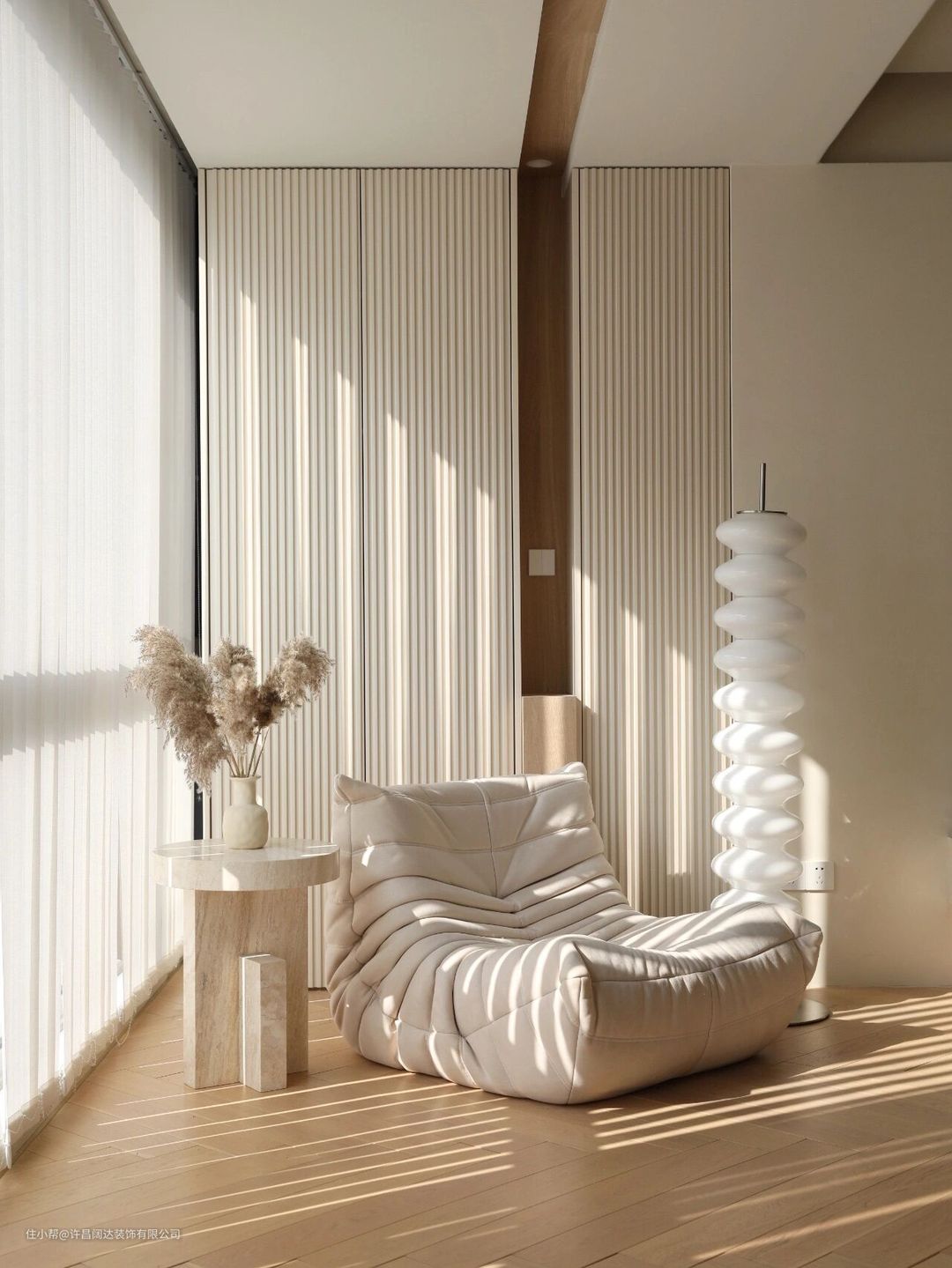 比如我家白色落地灯,搭配米白色沙发,奶乎乎超干净~晚上打开灯氛围感也很强。