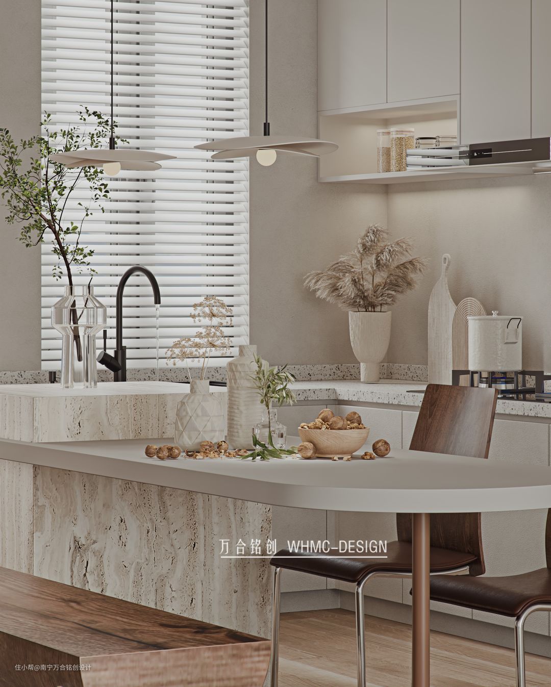 餐厅的设计融合各种自然材质木质、石头、绿植等使房子感觉就处于大自然中,将侘寂风格与东方禅意完美地糅合在一起以平静的心态创造出富有艺术感的空间