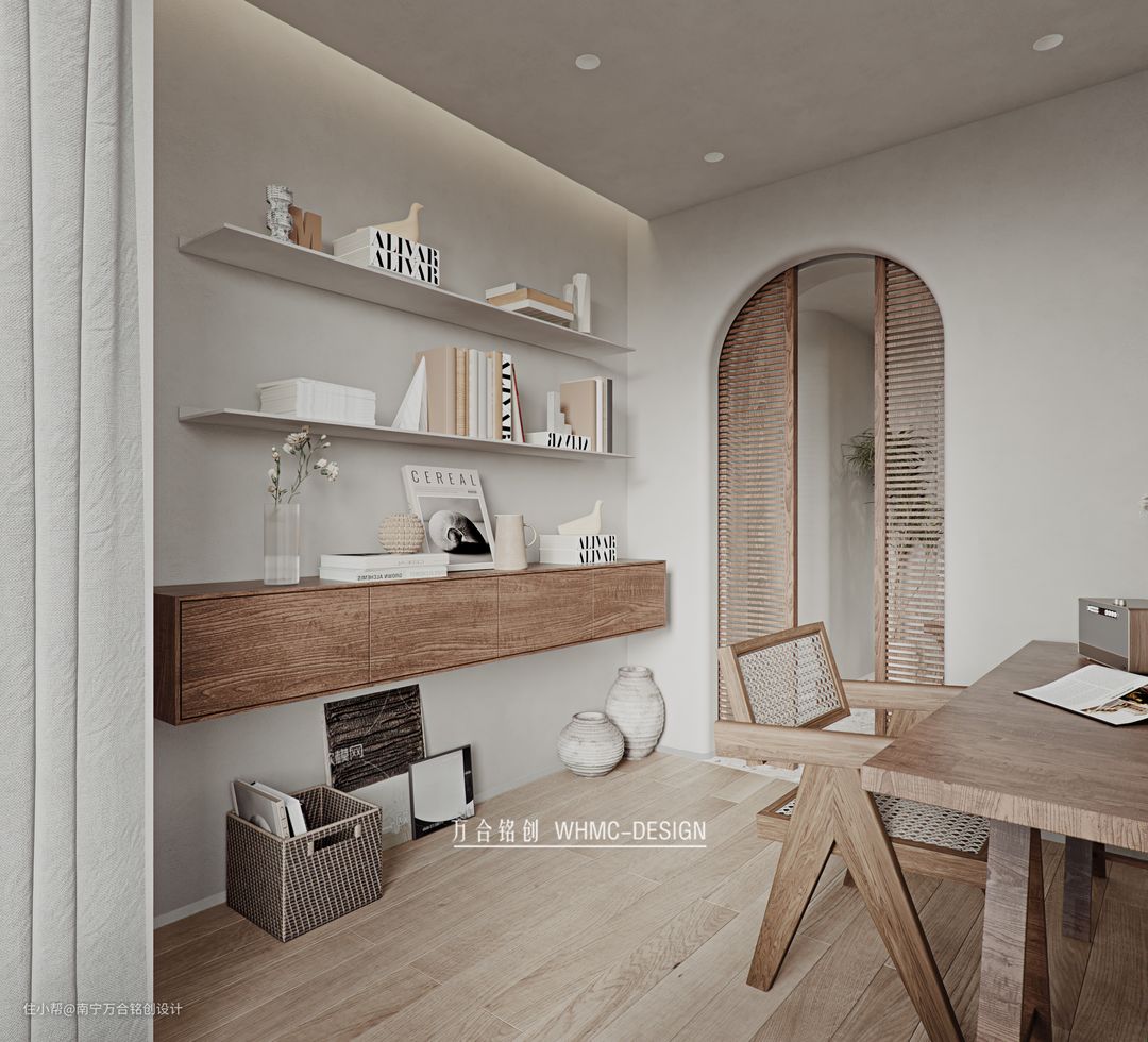 书房弧形门洞使用了镂空木条门作为隔断,左侧打造了一款悬空收纳柜,上方加上置物板,轻巧的收纳空间就形成了