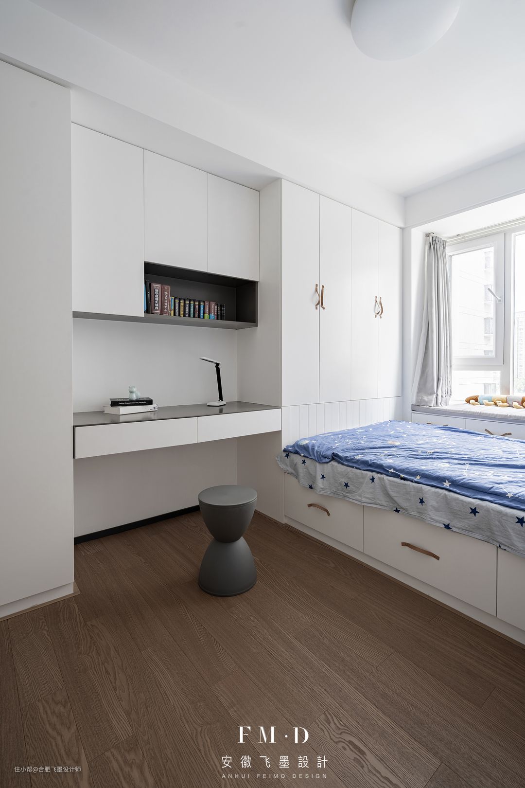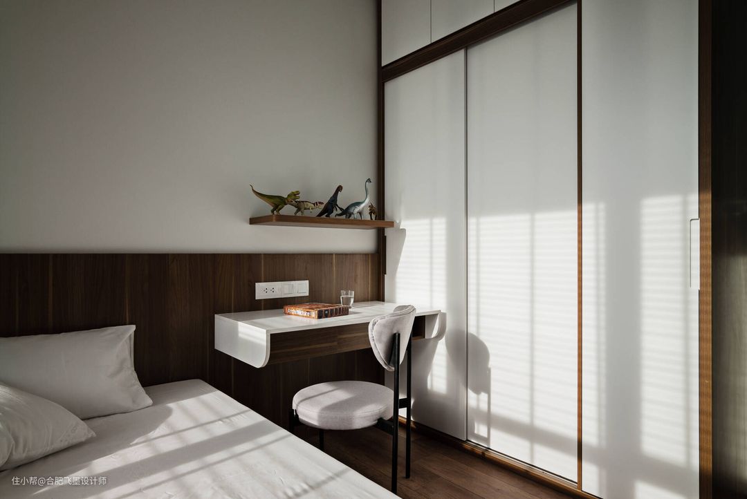 谁规定衣柜只能放在进门的一面墙,你把衣柜挪到床尾,或者房间面积小,试试做成榻榻米连体柜,衣柜放在床头也不错啊,书桌、床、储物空间都有了,对于小户型来说,真的将空间利用发挥到了极致。